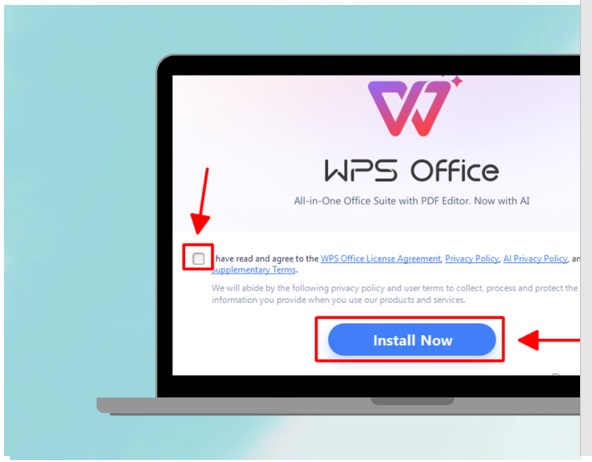 • Bước 3: Lúc tệp cài đặt đã được thực hiện download xong. Thì bạn mở nó thông qua việc thực hiện nhấn đúp vào. Sau đó bạn thực hiện đánh dấu tick vào ô đồng ý để tuân theo các điều khoản dùng của WPS Office ở trên màn hình máy tính. Sau lúc đó, bạn nhấn chọn “Install Now”.